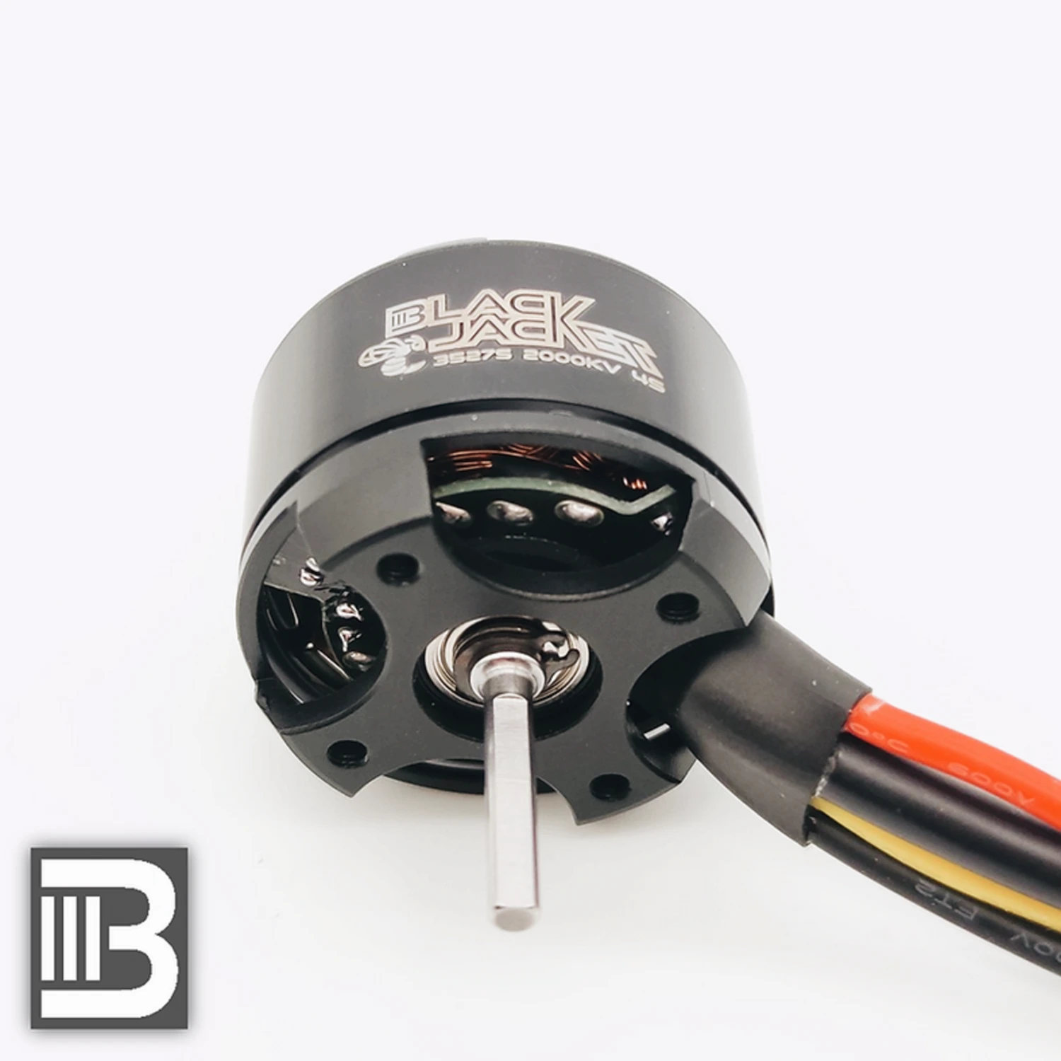 This is the all new BlackJacket 2000s! This sensored outrunner is very small and packs a punch. Since it is sensored it doesn’t cog like other outrunners. It has excellent power and braking for its size. It will also handle 2-speed 1/10 scale trucks on the trail with no problem. Plenty of power to wheelie your truck. This little guy only weighs 88g(3oz) with wires and bullets. It will fit vitually anywhere at at only 27.5mm long by 35mm diameter.