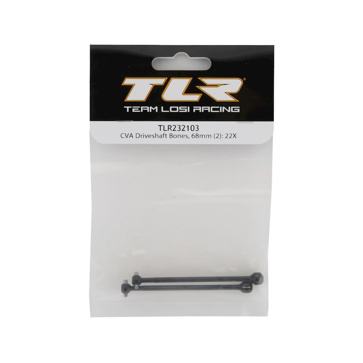 This is an optional set of two Team Losi Racing 22X-4 68mm CVA Driveshaft Bones, intended for use with the TLR 22X-4 Race Kit. These driveshaft bones are used in the front/center position.