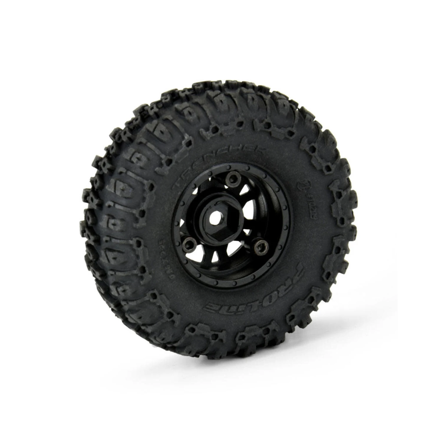 The Pro-Line SCX24 1.0″ Trencher Pre-Mounted Tires with Impulse Wheels take their inspiration from the ever-popular 1/10 Pro-Line Trencher tires. Designed for maximum grip, these 1.0″ tires are a perfect option for the Axial SCX24 line of rock crawler. The highly detailed connected tread on the sidewall of the Trencher extends out for great side-hilling performance on your mini-crawler. At 2.25″ tall by 0.85″ wide, the Trencher is ready to tackle the terrain and take you where the adventure leads.