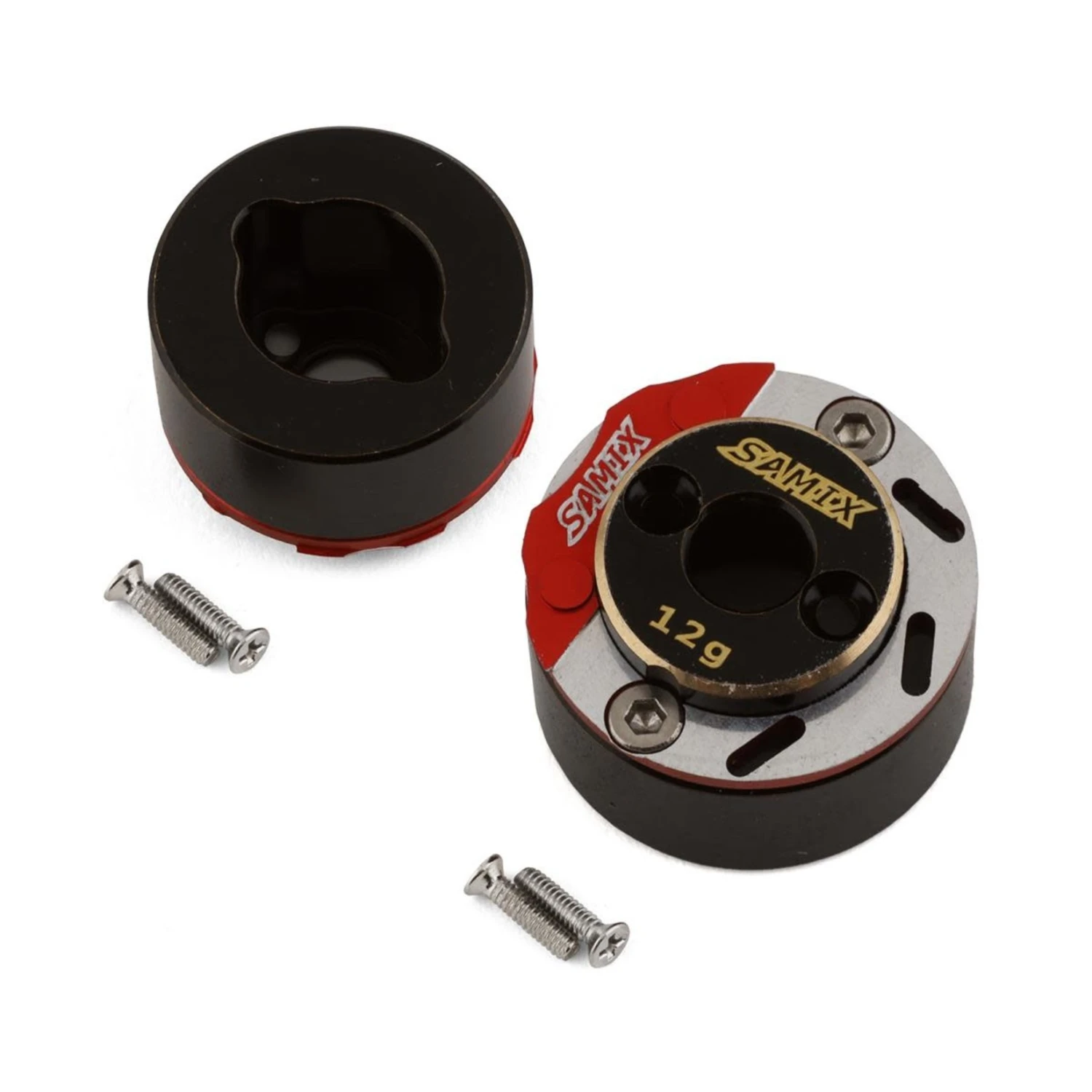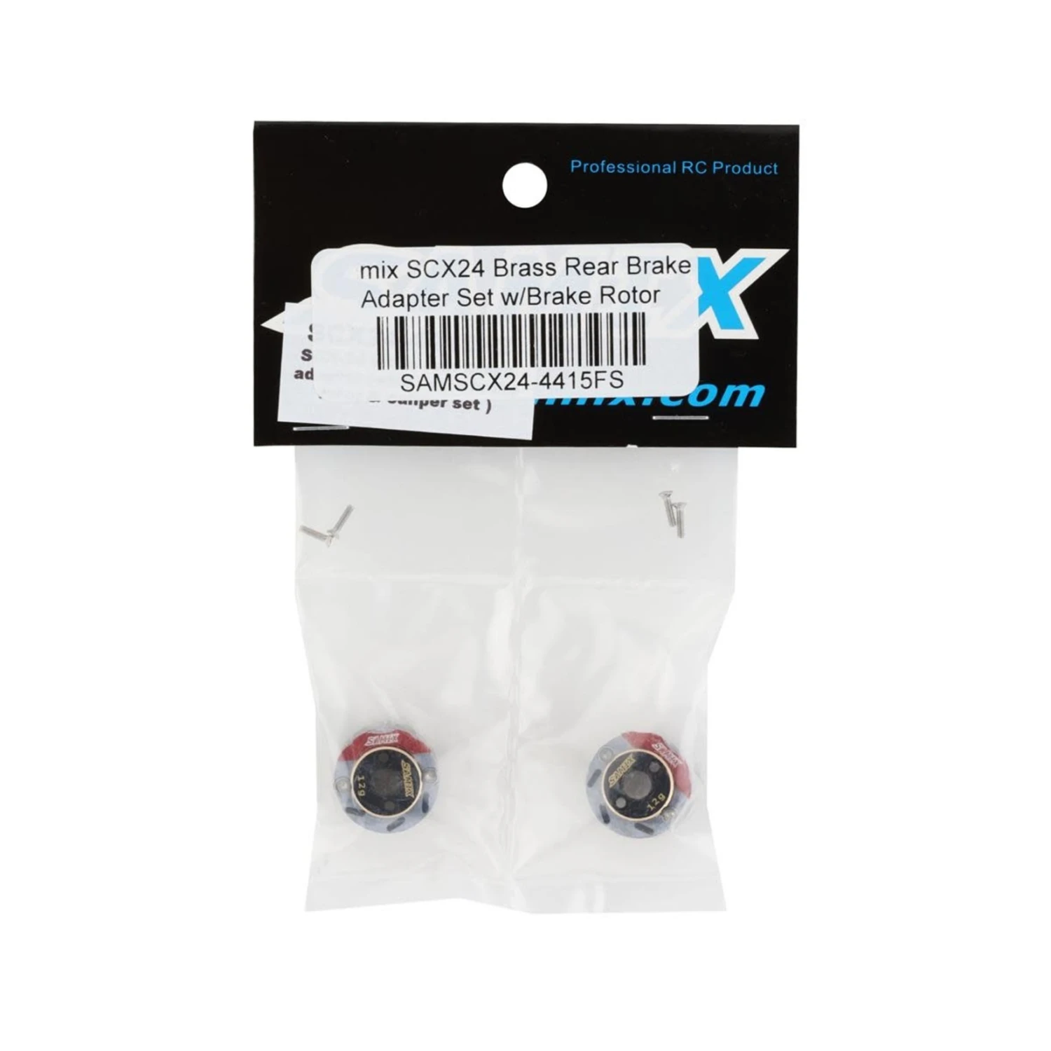 The Samix SCX24 Brass Rear Brake Adapter Set with Brake Rotor is a great way to add forward weight bias to your SCX24 based rig. These brake adapters are machined from brass and feature a slick black coating with gold chamfered edges that give the axle a custom look. Each brake adapter with brake rotor weighs 13 grams each to help improve the center of gravity. Package includes two rear brake adapters, two simulated brake rotors and mounting hardware.