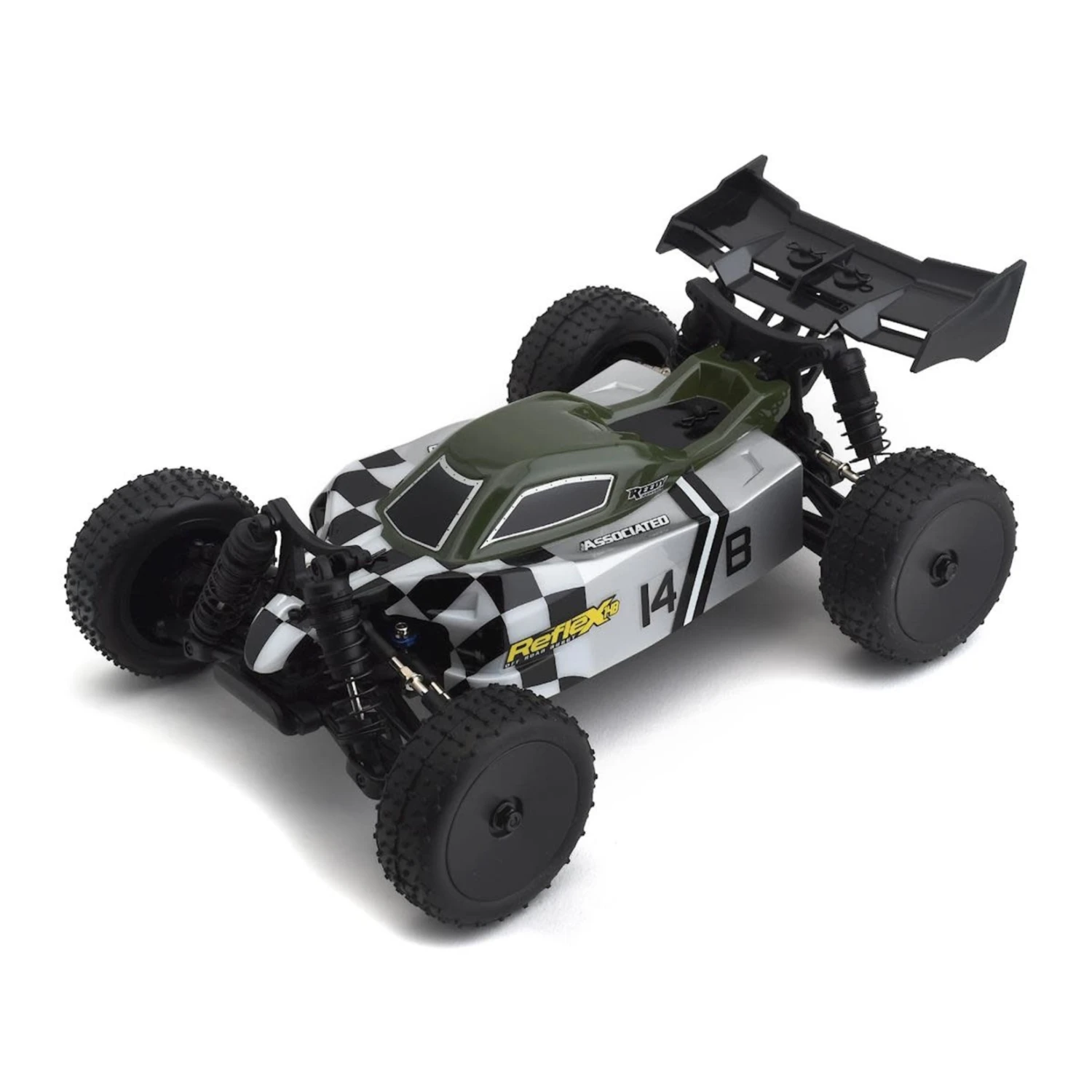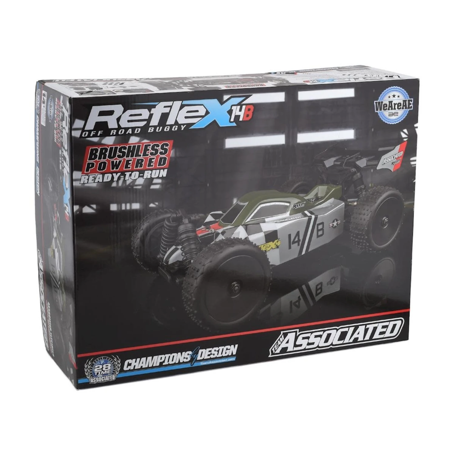 Team Associated’s 1:14 scale REFLEX 14B 4WD electric buggy comes out of the box already assembled, with a Reedy Power brushless speed control and motor, high-torque digital steering servo, and 2.4GHz radio system. With all that power at your disposal, the buggy’s design effortlessly channels it into 4WD fun! The adjustability offered by the turnbuckles, caster blocks, and rear hubs make the REFLEX 14B ready for any terrain you can throw at it. Additional features include three sealed differentials, aluminum steering rack, and lightweight aluminum center driveshaft. Adding a battery pack to the REFLEX 14B RTR, you can now have big performance in a small-scale Ready-to-Run package!