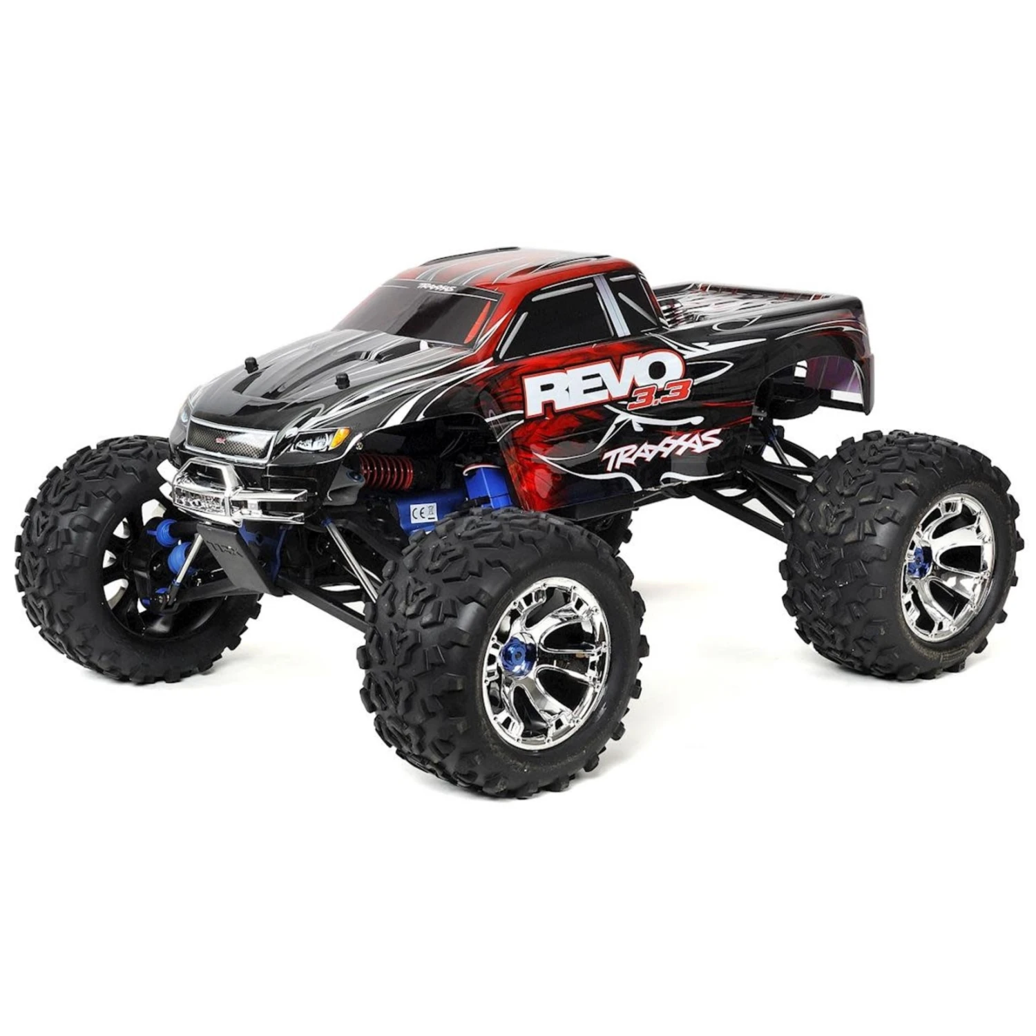 The Revo 3.3 Stands Alone as the Ultimate Nitro Monster Truck Monster innovation, monster versatility, and supreme size come together in the one truck that could only come from Traxxas. The Revo 3.3 defines what it means to be the pinnacle of monster truck performance, the standard bearer for cutting edge innovation and boundless capability that all others are measured against. The Revo 3.3 is pure monster to its core with its massive presence, meaner gaze, and feature-rich capability. More importantly, Revo’s advanced engineering equips it for fun, and the Revo 3.3 delivers even more of it! CHARGER NOTE: The included charger requires a cigarette lighter socket found in full size vehicles to charge. If this is not your preference, Traxxas offers an adapter allowing you to charge from a standard home AC electrical socket (TRA2976). Traxxas Stability Management (TSM) TSM allows you to experience all the extreme power, speed, and acceleration that was engineered into your E-Revo making it much easier to control on common slippery surfaces such as dusty asphalt, smooth concrete, and even ice and snow. Factory-Installed Telemetry Sensors Traxxas Link collects and records real-time telemetry data as you drive. When you equip your model with optional telemetry sensors, the Traxxas Link dashboard comes to life showing you speed, battery voltage, RPM, and temperature. Features: Ready-To-Drive with included NiMH receiver pack and EZ-Start battery, 2-amp DC Peak Detecting Fast Charger, fuel-filler bottle, spare glow plug, precision tools, and more! TQi 2.4GHz Transmitter with Traxxas Link Wireless Module and Receiver Traxxas Stability Management (TSM) Factory installed telemetry sensors – RPM, speed, temperature, and battery voltage Wider, taller stance with Geode wheels and 6.3″ Maxx-sized tires Sinister body with ferocious graphics Heavy-duty reversing transmission with exclusive OptiDrive Electronic Shift Module Dual digital waterproof ball-bearing servos with 250 oz.-in. combined torque Specifications: Length: 20.65″ (525mm) Front Track: 17.5″ (444.5mm) Rear Track: 17.6″ (447mm) Weight (no fuel): 10.3lbs (4.69kg) Center Ground Clearance: 4.25″ (108mm) Height (overall): 11.024″ (280mm) Wheelbase: 13.7″ (348mm) Gear Ratio (1st Gear): 25.55:1 Gear Ratio (2nd Gear): 16.31:1 Transmission: OptiDrive Auto Two-Speed FWD/REV Transmitter: Traxxas TQi™ 2.4GHz radio system with Traxxas Link Wireless Module (3-Channel) Receiver: Traxxas Stability Management (TRA6533) Engine (fuel-powered): TRX 3.3 Racing Engine w/ EZ-Start Brake Type: Steel Disc with semi-metallic pads Fuel Tank Capacity: 150cc Top Speed: 45+mph Skill Level: 4 Includes: RTR Revo 3.3 & TQi Radio System Receiver Battery Pack EZ-Start EZ-Start Battery 2Amp DC Battery Charger Extra Glow Plug Fuel Bottle Extra Air Filter High-Quality Specialty Tools Needed To Complete: Nitro Fuel (4) “AA” Batteries (for transmitter)